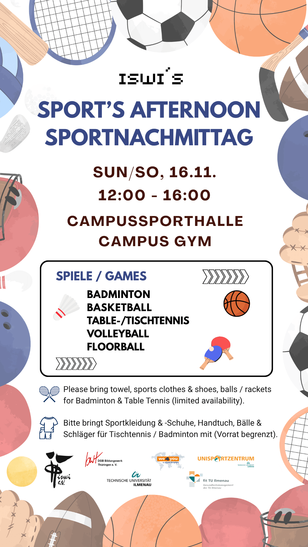 Kommt zu unserem ersten ISWI-Sportnachmittag im Wintersemester am So, 16.11. 12-16 Uhr in die Campussporthalle. Egal ob Anfänger:innen oder Fortgeschrittene – für alle ist etwas dabei. Alle Angebote sind kostenlos und ihr müsst euch auch nicht vorher anmelden. Bitte bringt Sportkleidung, Wasser, Handtuch und Sportschuhe mit. Euch erwartet dieses Mal Floorball (~ 12-13 Uhr), Volleyball (~ 13-14:30 Uhr)Basketball (~ 14:30-15:45 Uhr)Badminton und Tischtennis (12-15:45 Uhrbitte Schläger und Bälle mitbringen). Lasst uns uns zusammen bewegen.